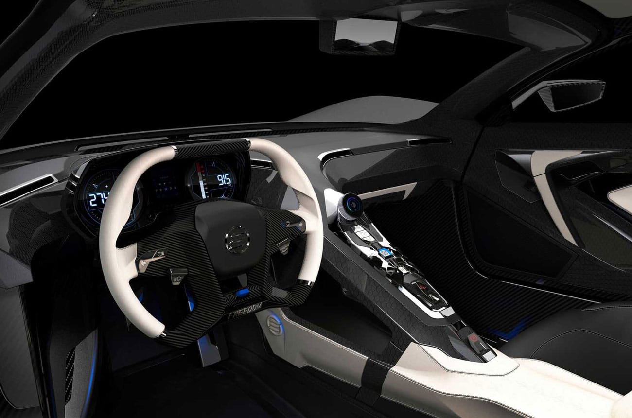 Su carrocería deportiva y con formas aerodinámicas incluye materiales en fibra de carbono. Mientras que el interior está inspirado en los cazas de combate, con instrumentación digital y una consola central sencilla.