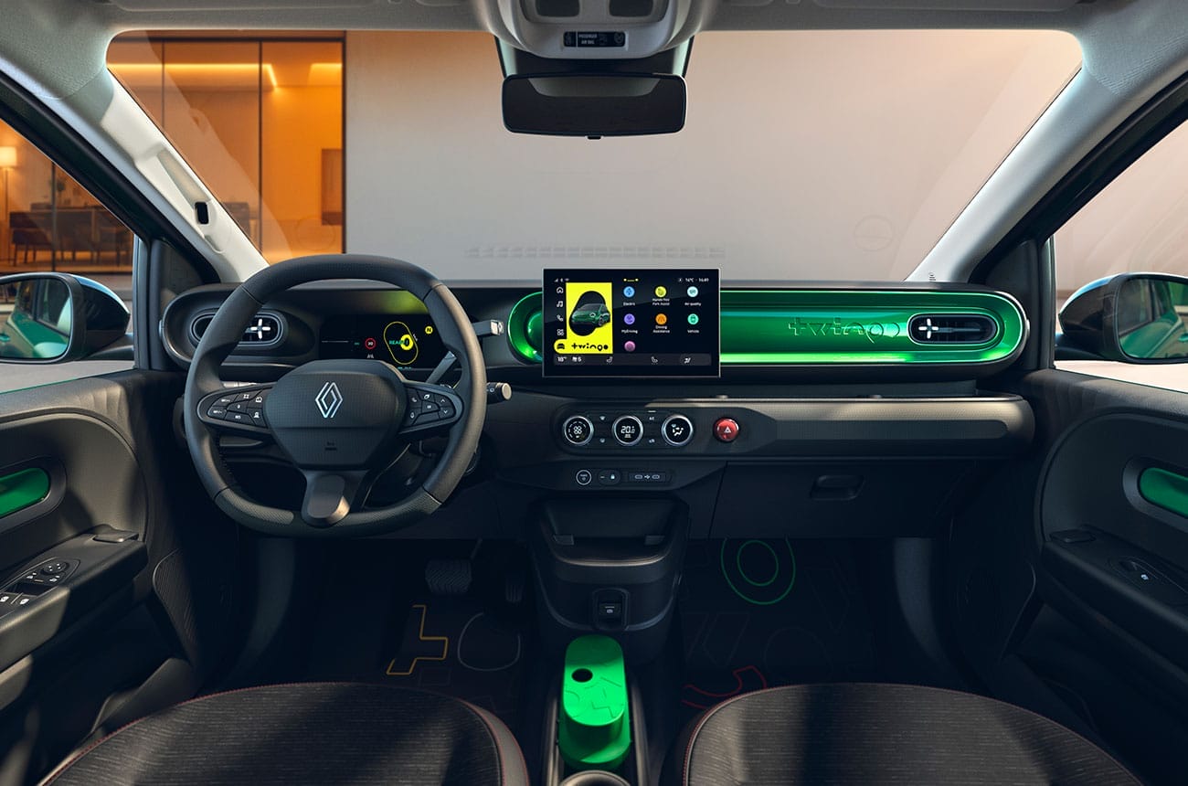 El entorno interior del Twingo se inspira en el universo digital actual. La cabina adopta un diseño horizontal con dos pantallas: un cuadro de instrumentos digital de 7 pulgadas y una pantalla multimedia central de 10 pulgadas equipada con el sistema OpenR Link con Google integrado.